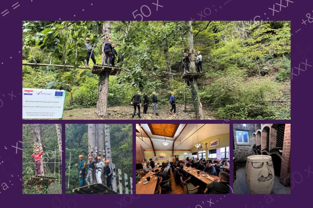 Uživali smo u slavonskim specijalitetima na moderan način, odradili vježbe orijentacije i adrenalinski izazov – hodanje među krošnjama i zipline u Geoparku Papuk. Neki su hrabro zakoračili, neki uz malu dozu straha, ali je izazov svladan. Guštali smo i u vinariji Krauthaker i čuli zanimljivu priču o Zagorcu koji je u Kutjevo došao zbog sporta, ostao zbog ljubavi, a danas proizvodi vrhunska vina. Dan je zaokružila slavonska večera s neizostavnim tamburašima.